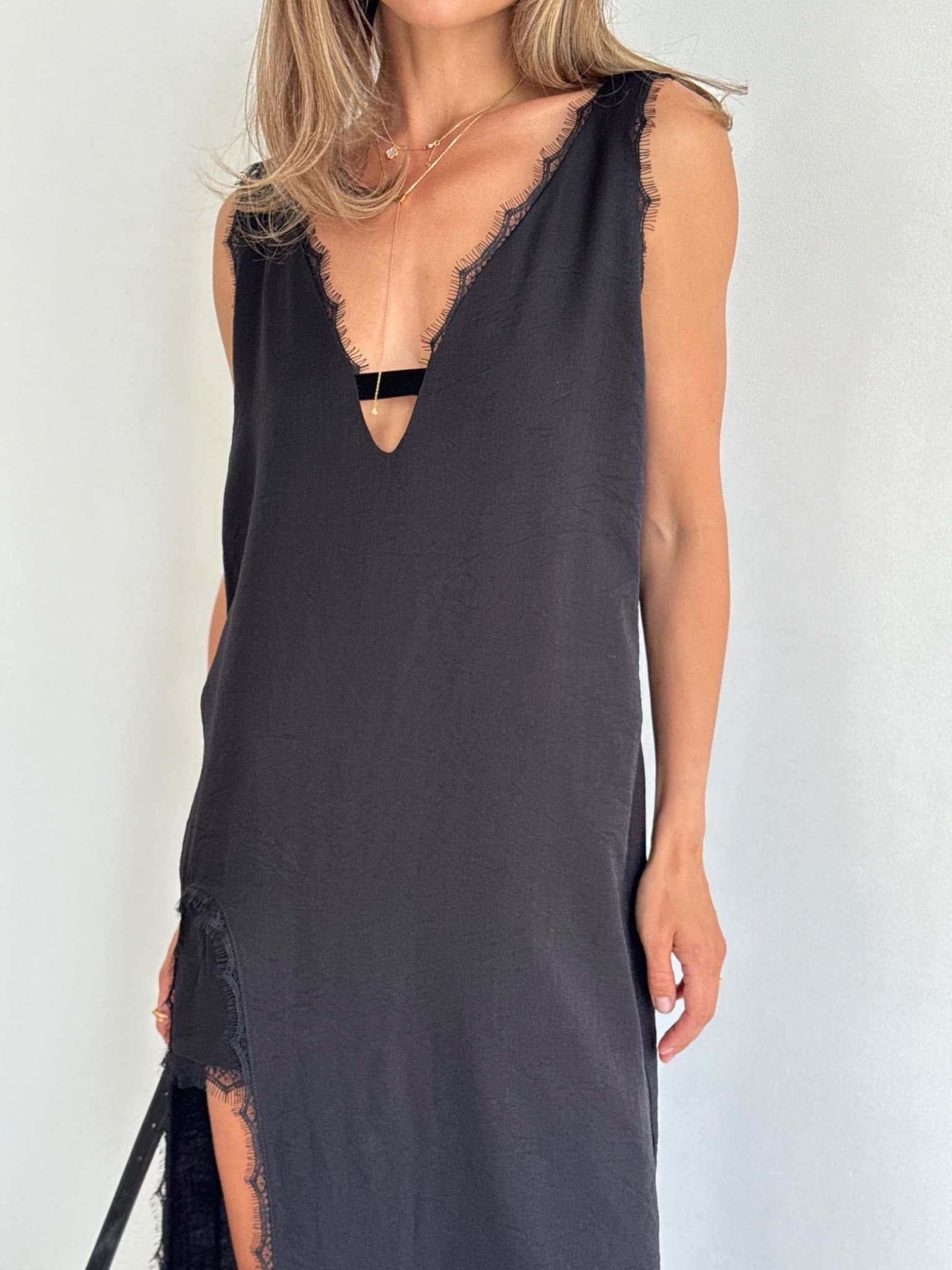 The lightweight fabric drapes beautifully, while the side slit adds movement and a subtle, feminine edge.
