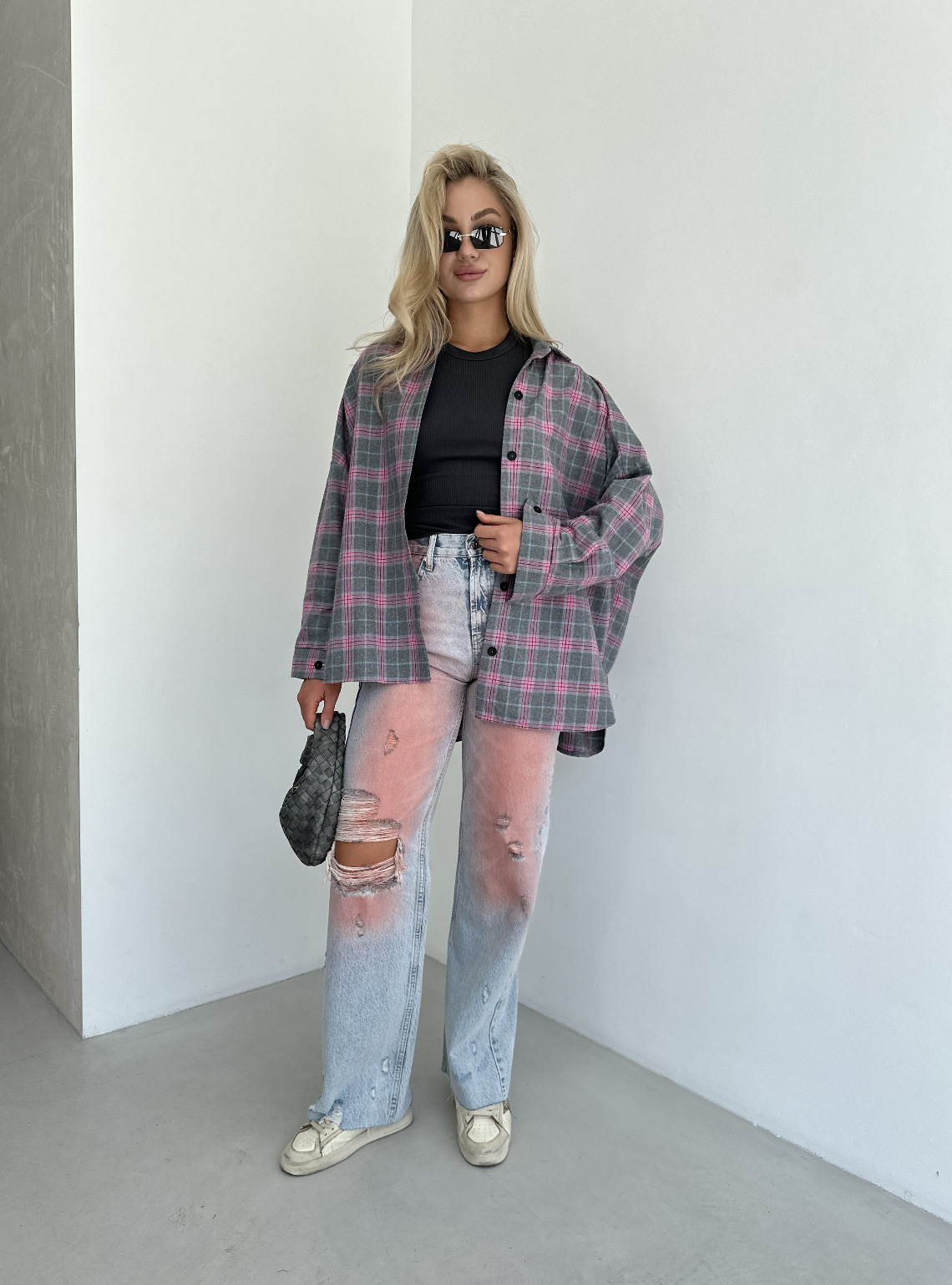 Oversized Plaid Shirt with Snap-Button Sleeves
