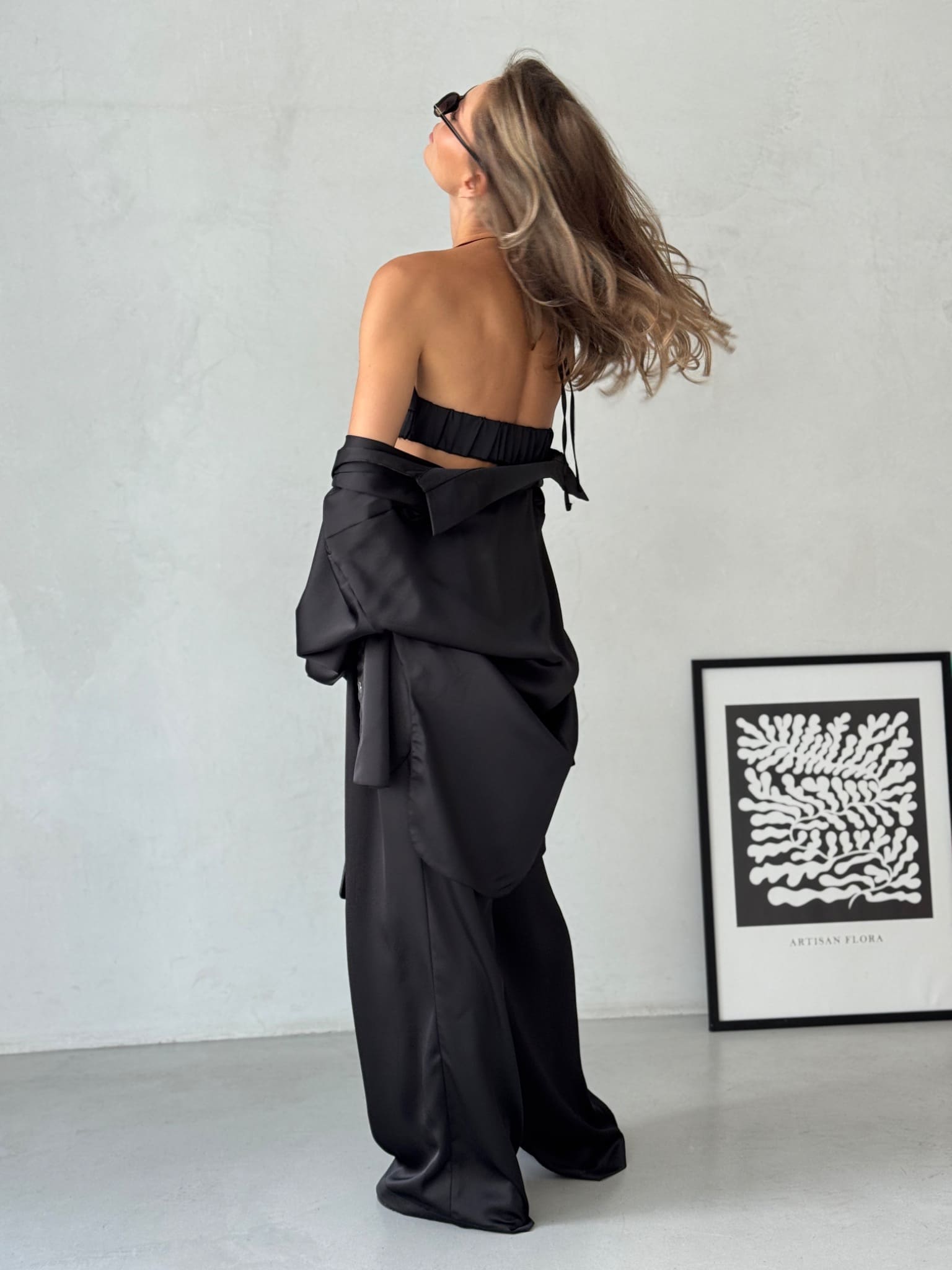 The smooth, fluid fabric drapes beautifully, creating an elegant yet effortless silhouette.
