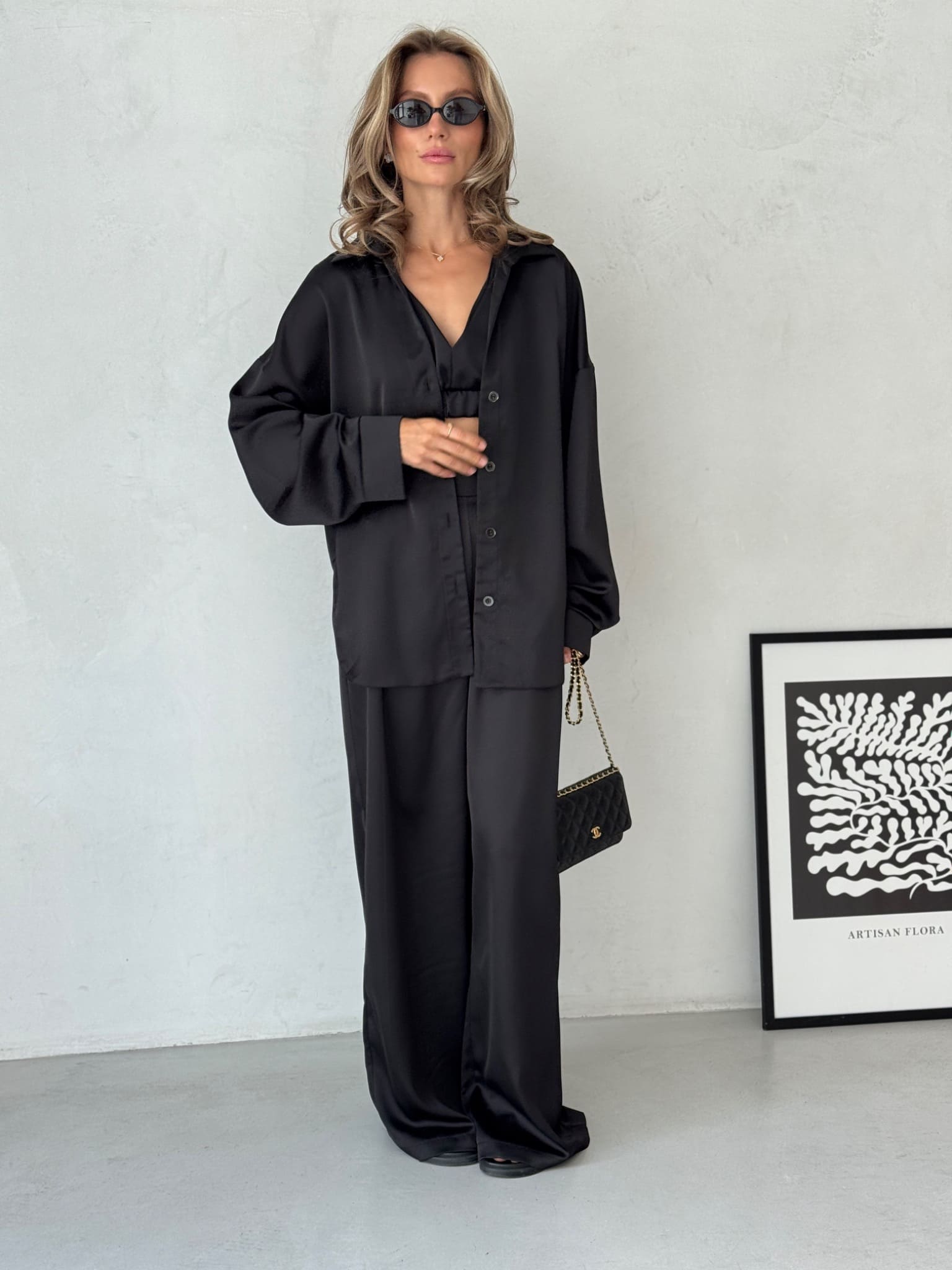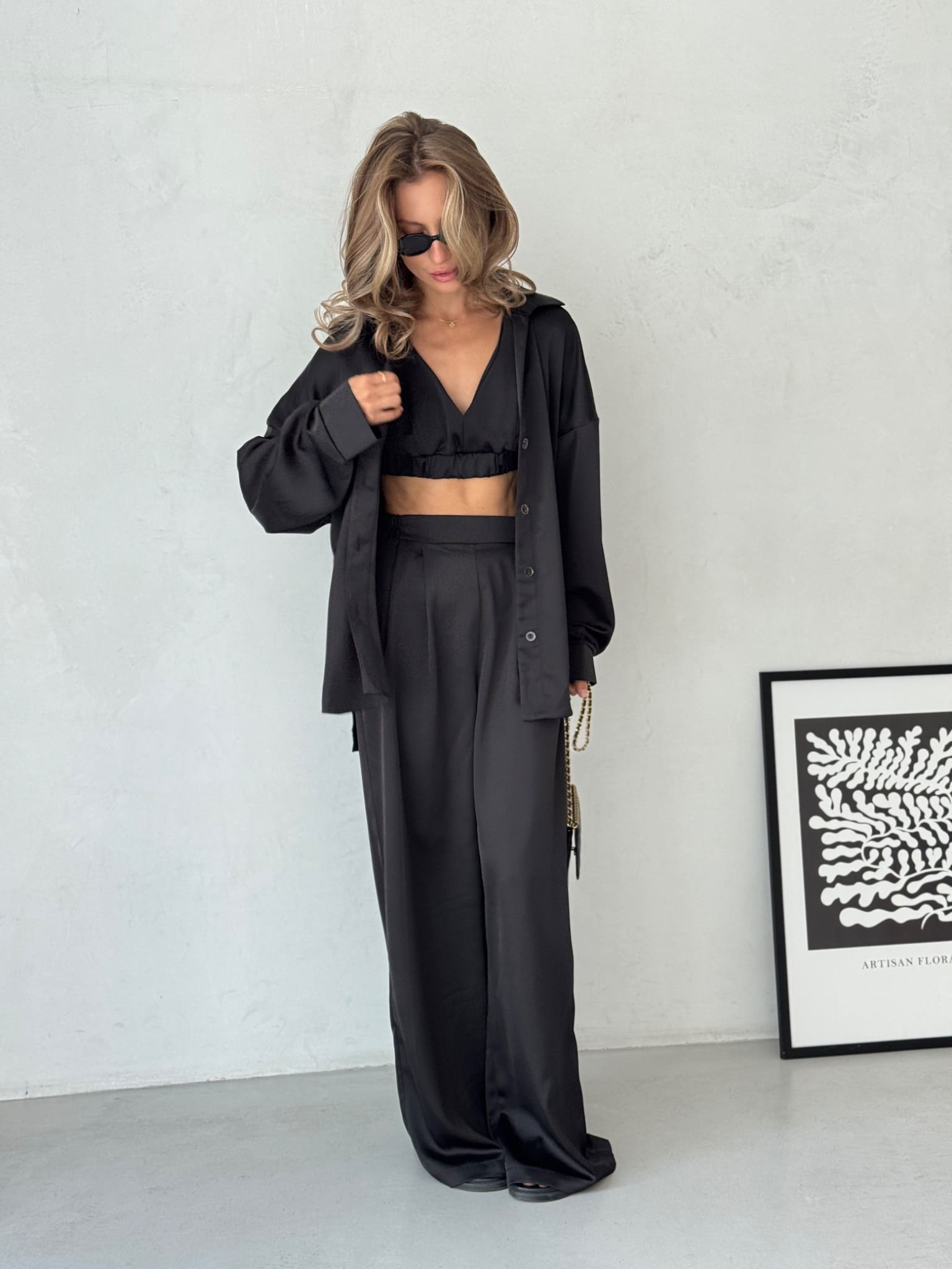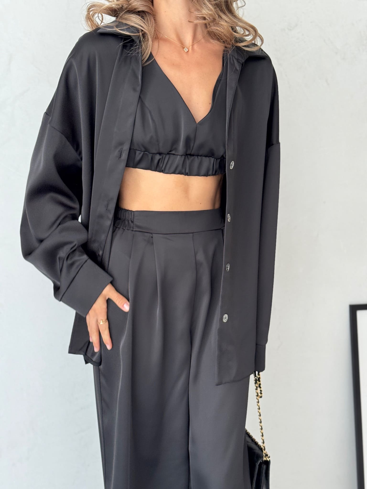 + Free ShippingA refined three-piece silk set featuring a soft bralette top, wide-leg trousers, and a relaxed button-up shirt.